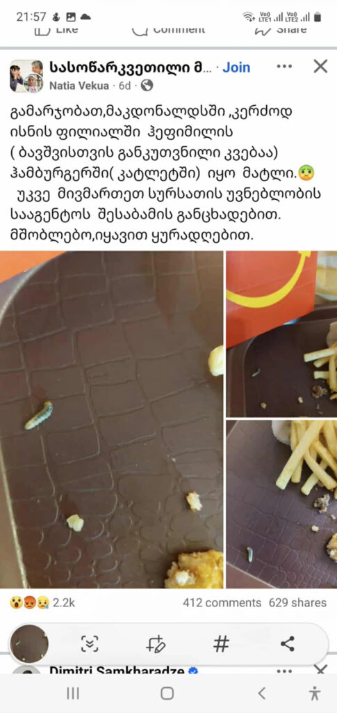 ერთ-ერთმა მომხმარებელმა ნათია ვეკუამ McDonald’s-ის საბავშვო მენიუში მატლი აღმოაჩინა. ამის შესახებ ინფორმაცია მან სოციალურ ქსელში გაავრცელა და საზოგადოებას სიფრთხილისკენ მოუწოდა. მისივე თქმით, ინფორმაცია უკვე „სურსათის ეროვნულ სააგენტოს“ მიაწოდა: